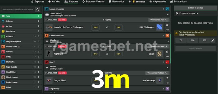 O 3nn oferece uma grande seleção de opções de apostas em e-sports com probabilidades competitivas
